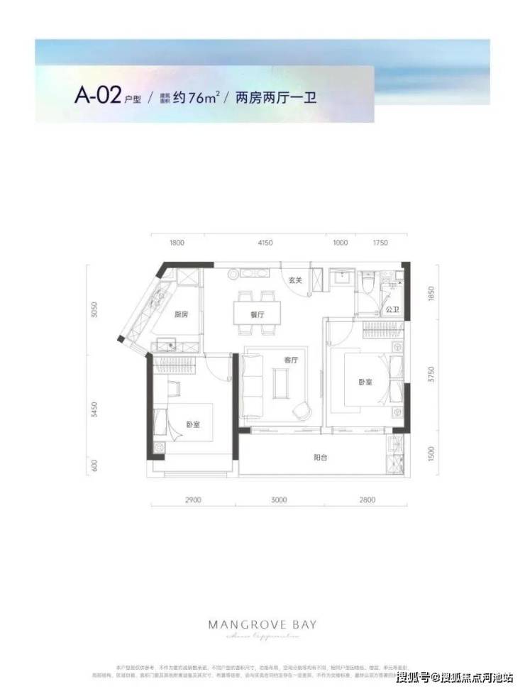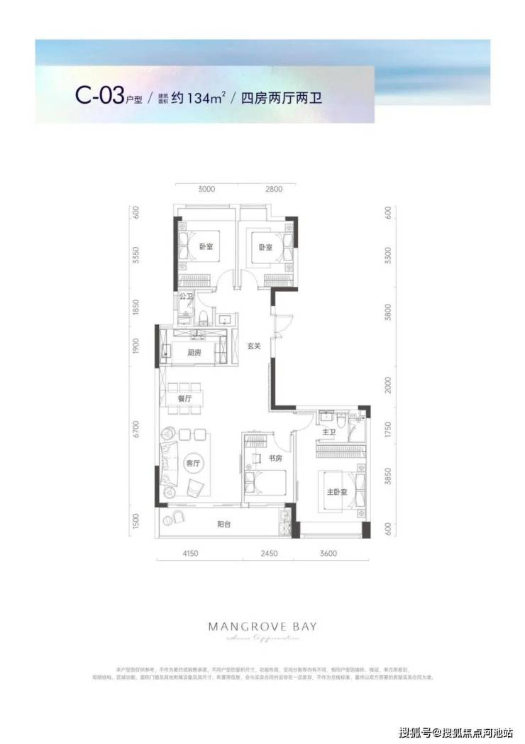 A02户型76平2房2厅1卫:房间和客厅朝南向,采光充足;约5.8米开阔观景阳台,俯瞰红树林自然生态;动静干湿自然分离,生活有序互不干扰。F01户型93平3房2厅1卫:客厅、餐厅连通阳台,自然采光充足;宽景竖厅,空间开阔;主卧独立卫生间,隐私雅奢生活;动静干湿分离。G01户型112平3房2厅2卫:同样拥有客厅、餐厅连通阳台的设计,自然采光充足;全屋飘窗,尽享超大采光面;主卧独立卫生间;动静干湿分离。C03户型134平4房2厅2卫:方正紧凑格局,合理精研每一寸空间;独立私家书房;约6.6米宽阔景观阳台;客厅、餐厅连通阳台;主卧飘窗。