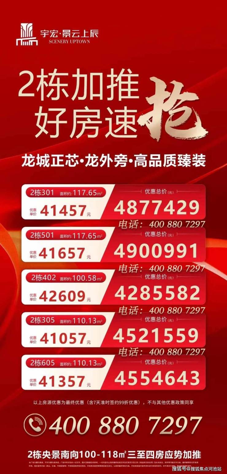 宇宏景云上辰这次加推的2栋,预约看房的话可以尊享8.9折优惠,折后均价4.73万/㎡,折后单价4.15-5.65万/㎡,总价429-665万/套,以下价格预约看房更优惠。