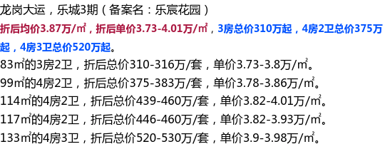 免责声明:以上展示的关于龙岗乐城三期(乐宸花园)楼盘最新相关图文资料可能有部分来自于网络,一切信息以最终在在我们楼盘现场签署的购房合同为准,如图文内容可能无意中侵犯某方权益的话,请及时联系我们将配合处理。