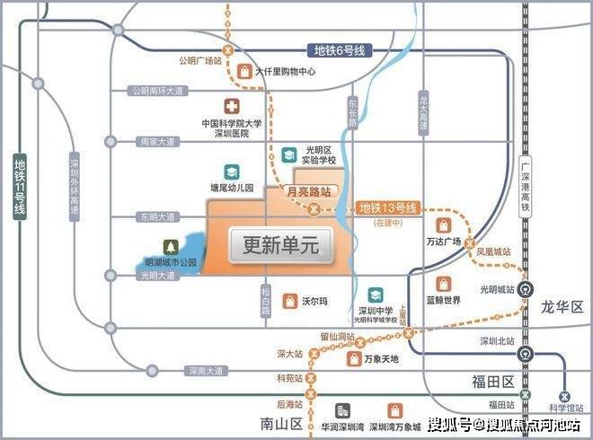 片区更新单元有轨道快线13号线(在建)穿过,是13号线(在建)月亮路站的TOD大城。