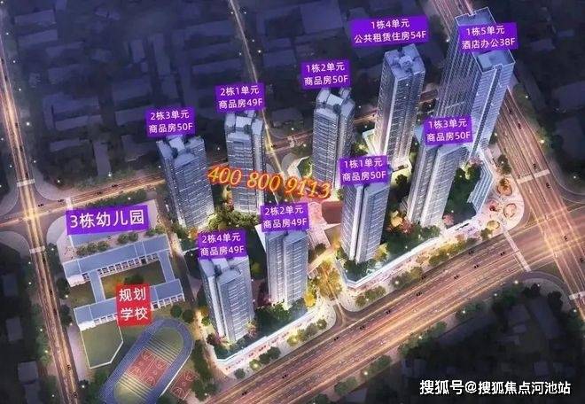 创城云璞花园分为两个地块开发,共由9栋超高层建筑组成,其中1栋1/2/3单元商品房50F,1栋4单元公共租赁住房54F,1栋5单元办公酒店38F,2栋1/2/4单元商品房49F,2栋3单元商品房50F,3栋是1所9班幼儿园。