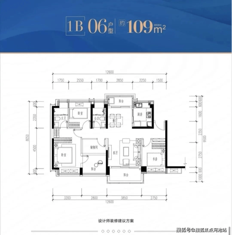 1B-06 户型:约109㎡ 阔绰四房两厅两卫: