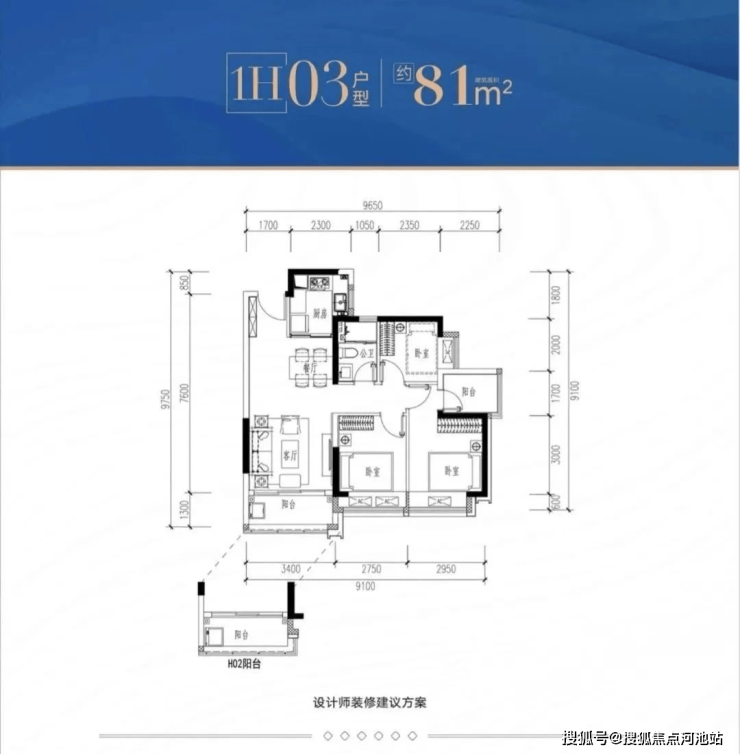 1H-02/03户型:约81㎡ 三房两厅两卫: