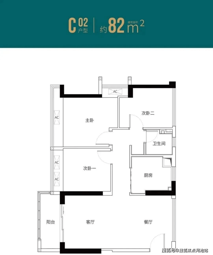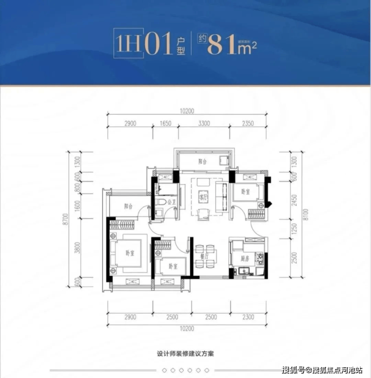 1H-01户型:约81㎡ 三房两厅两卫: