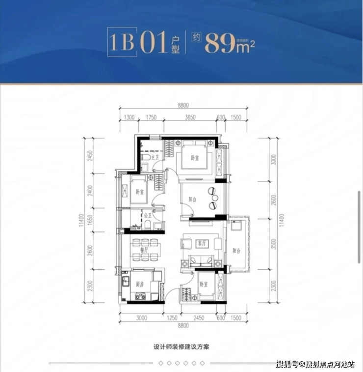 1B-01户型:约89㎡ 四房两厅两卫: