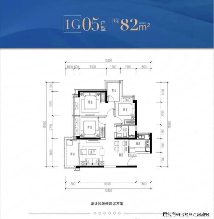 1G-05户型:约82㎡ 三房两厅两卫: