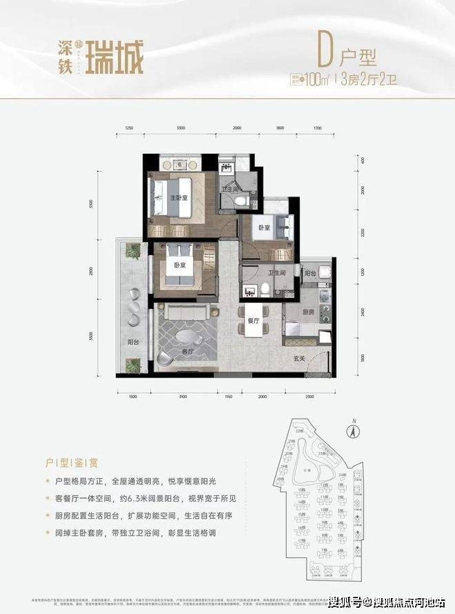 深铁瑞城在售户型以建面约96-100㎡的三房为主,包含4个户型,全明采光,竖厅南北通透,6.3米观景阳台,主卧套房设计,兼顾舒适性与实用性。
