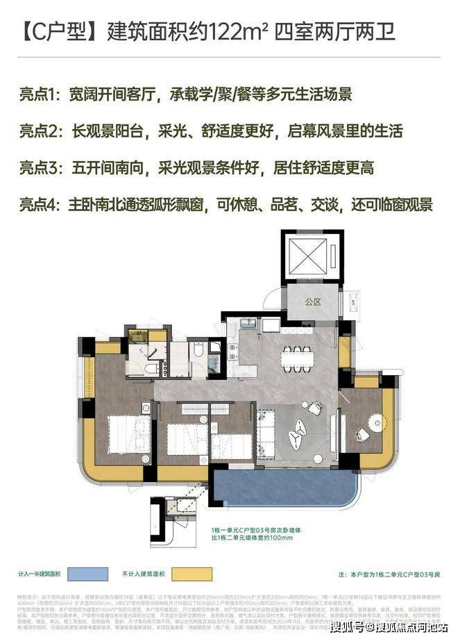 建面约 142㎡ 南北方厅 阔景四房:采用南北通透设计,空间尺度开阔,业主可享受阔绰的观景体验,适合追求高品质生活的大家庭;