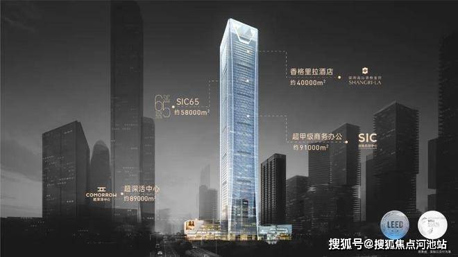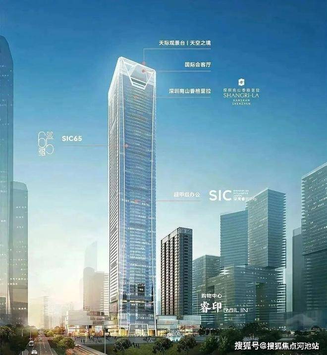 358米深圳第九高楼,深超总片区首个TOD商务综合体,集购物中心、五星级酒店、超甲级办公及私邸于一体,定位“全球城市灯塔地标”