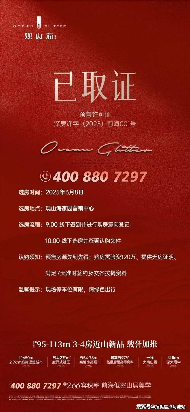 最新消息:位于深圳市南山区蛇口的新楼盘,远洋·观山海家园已于2025年3月7日取证,定于3月8日上午10点开盘选房,本次加推2栋1/2/3单元,共295套房源,面积有95㎡的3房2卫,110-113㎡的4房2厅2卫户型,备案均价8.57万/㎡,备案单价7.58-9.72万/㎡,总价747-1105万/套,远洋观山海交房时间预计在2026年12月份带简装交楼。如需了解更多详情欢迎咨询远洋观山海家园开发商售楼部电话:400-880-7297(已认证)中介请勿扰!