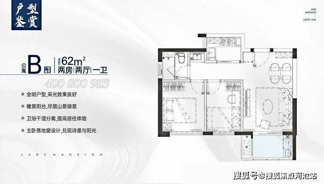 约62㎡ 实现两房两厅一卫功能配置,独立明厨和三分离明亮卫浴,主卧可放置2米双人床,厅出阳台。