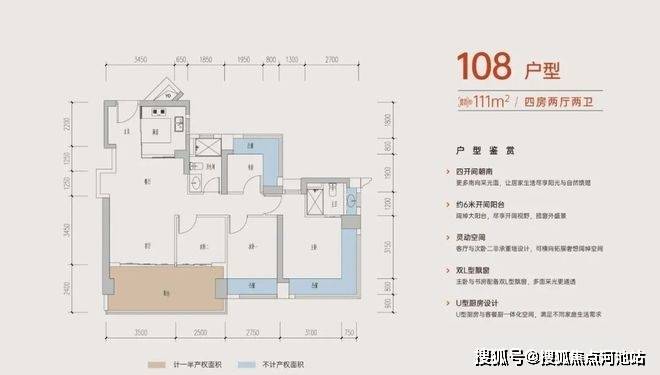 108-110㎡的4房2厅2卫,A户型,设计的是经典竖厅格局,进门入户玄关,客厅3.45米开间,LDKB一体化,S墙设计预留冰箱卡槽位,四开间朝南,动静分区,主卧+1个次卧270度大飘窗,客厅连接次卧出6米长大阳台,分别做到了主卧16.4㎡/次卧11.2㎡/次卧7.84㎡/次卧6.25㎡(包含墙体飘窗),U型厨房,卫生间干湿分离,得房率约:77.3-77.39%(不含赠送),西南朝向。赠送面积18.4㎡,加上赠送得房率94.04%。