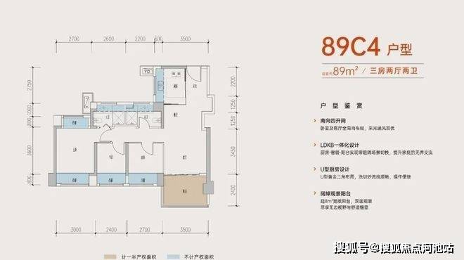 89㎡的3房2厅2卫,B户型,设计的是经典竖厅格局,进门入户玄关,客厅3.5米开间,LDKB一体化,动静分区,三开间朝南,S墙设计预留冰箱卡槽位,主卧+1个次卧270°飘窗,分别做到了主卧15.1㎡/次卧8.52㎡/次卧7.77㎡(包含墙体飘窗),U型厨房,卫生间干湿分离,得房率约:77.39%(不含赠送),西南朝向。赠送面积16.96㎡,加上赠送得房率96.84%。