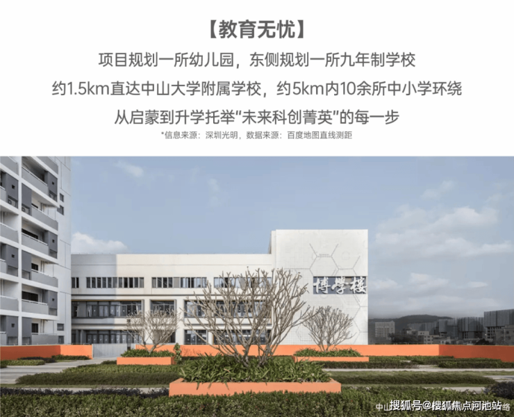 小学学区划分在东周小学(距离约2.7公里)、华南师范大学附属光明星河小学(距离约2.5公里)、修远小学、深圳小学光明曙光学校(距离约2.7公里)、南科大荔园学校小学部(距离约1.8公里)、中科实验教育集团光明楼村第二学校、深圳市教育科学研究院实验学校(光明)小学部、中山大学深圳附属学校小学部(距离约1.8公里)、楼村小学、公明中学小学部。