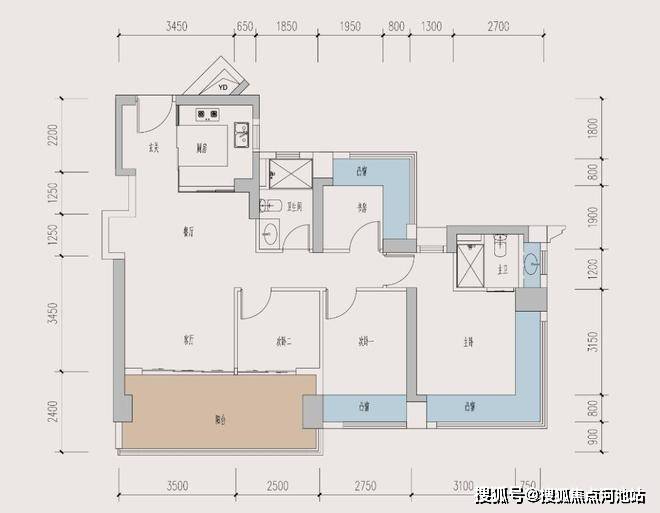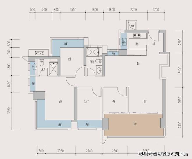 设计的是竖厅格局,进门入户玄关,客厅3.5米开间,LDKB一体化,S墙设计预留冰箱卡槽位,四开间朝南,动静分区,主卧南北双飘窗,全屋7面飘窗,3个卧室分别做到了主卧16.6㎡/次卧9.18㎡/次卧8.16㎡(包含墙体飘窗),U型厨房,卫生间干湿分离,得房率约:96.4%(包含赠送),东南或西南朝向。