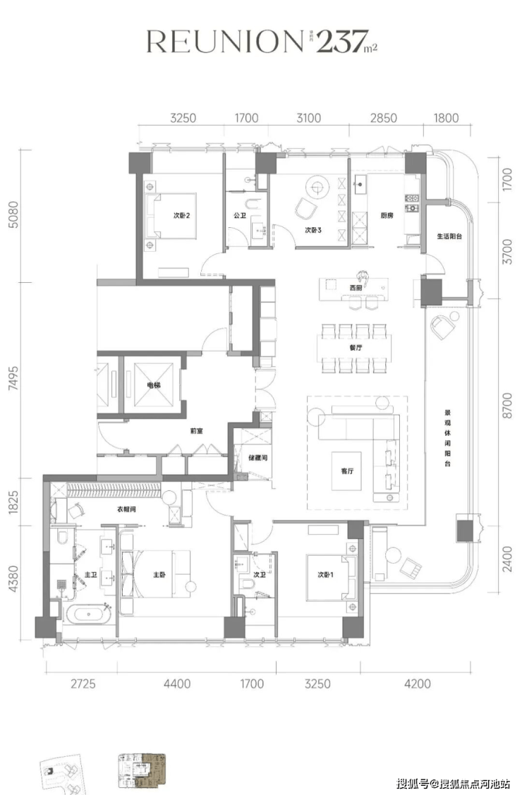 一体化餐客厅进深约6米,开间约8米,连接观景阳台,面积高达约48㎡,塑造休闲会客的尺度感。超大阳台做了景观、家政功能的双区分,阳台总面积约22㎡,休闲与晾晒互不干扰。
