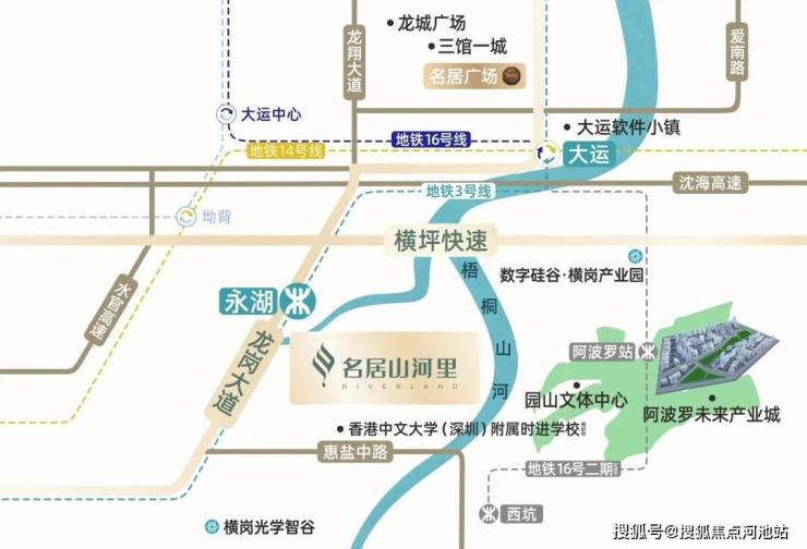 本项目位于龙岗区园山街道3号地铁线永湖站东南侧150米,地处龙岗黄金三角地带,北邻大运新城,东侧是阿波罗未来产业城,西南侧是横岗中心片区。