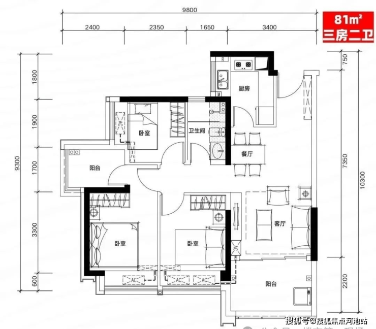 H01户型:81㎡三房二厅二卫