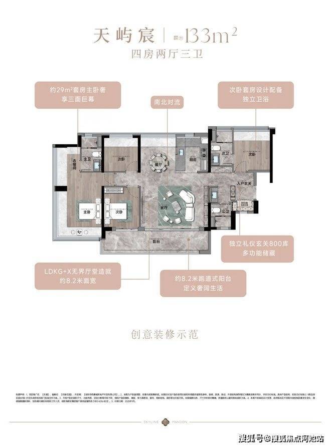 133㎡的4房2厅3卫,设计的是竖厅南北通透格局,进门入户玄关,客厅5.4米开间,餐客厅分离设计,分别做到了主卧24.5㎡/次卧10.2㎡/次卧8.96㎡/次卧7.84㎡(实测面积),客厅连接次卧出12.3m²的观景大阳台,L型中式+岛台灵动式厨房,公卫三段式干湿分离,得房率约79.5%(不含赠送),套内面积105.78㎡,阳台主朝东南或西南向。亮点:超大客餐厅南北对流+8.2米长超大观景南向阳台,超大主卧+270°无柱转角飘窗+进门独立玄关800库。