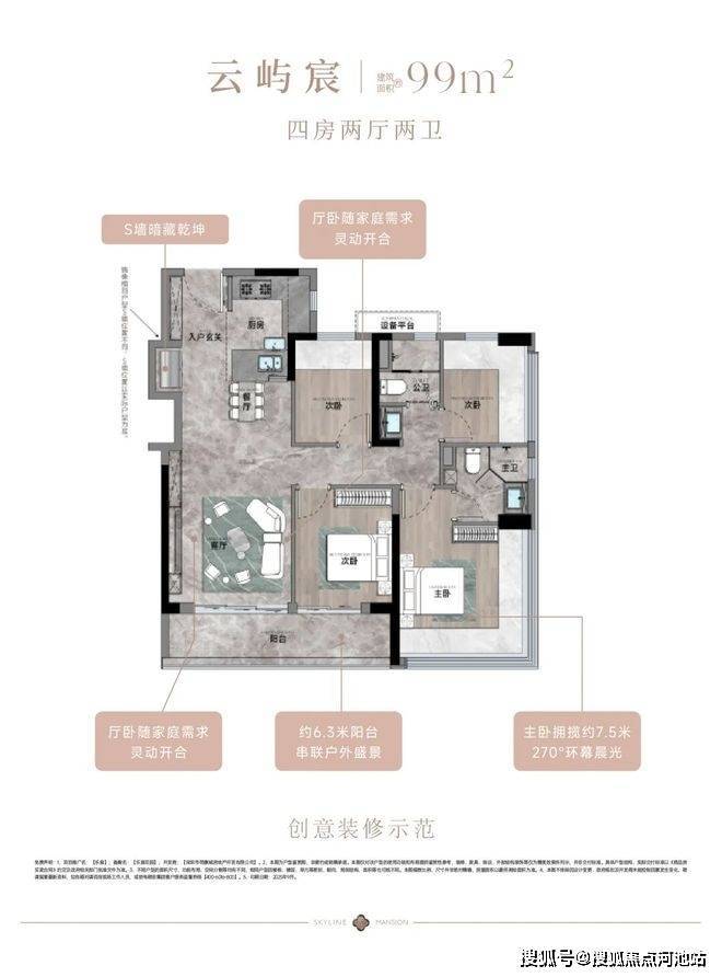 99㎡的4房2厅2卫,设计的是竖厅格局,客厅3.55米开间,LDKB一体化,S墙设计预留双开门冰箱卡槽位,三开间朝南,动静分区,分别做到了主卧15.26㎡/次卧9.57㎡/次卧6.96m²/次卧6.96㎡(包含墙体飘窗),U型厨房,公卫三段式干湿分离,赠送设备平台,得房率约79.5%(不含赠送),套内面积79.29㎡,客厅连接次卧出9.37m²大阳台西南或东南朝向。亮点:99平做到了4房2卫,主卧270°无柱转角飘窗,厨房烟道外置+额外赠送设备平台,并且是纯南向格局。