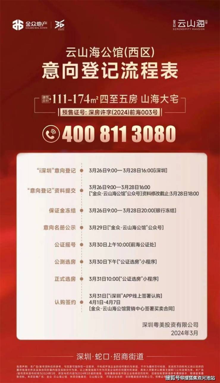 最新消息:深圳南山蛇口赤湾金众云山海3月35日正式获批预售!价格:开盘85折本次111㎡折后约732-805万,116㎡折后781-871万,117㎡折后777-863万,带精装,折后单价约6.57万起,龙华价格买南山新盘,总价仅要约732万起就能买蛇口山海4房,项目于2026年6月30日交楼。如需了解更多详情欢迎咨询金众云山海开发商售楼处400热线电话。