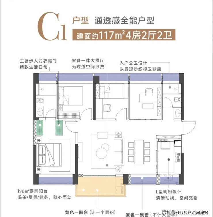 建面约117㎡横厅4房2厅2卫,与116㎡同个面积在横厅设计,自然是可以满足南北通透的需求。