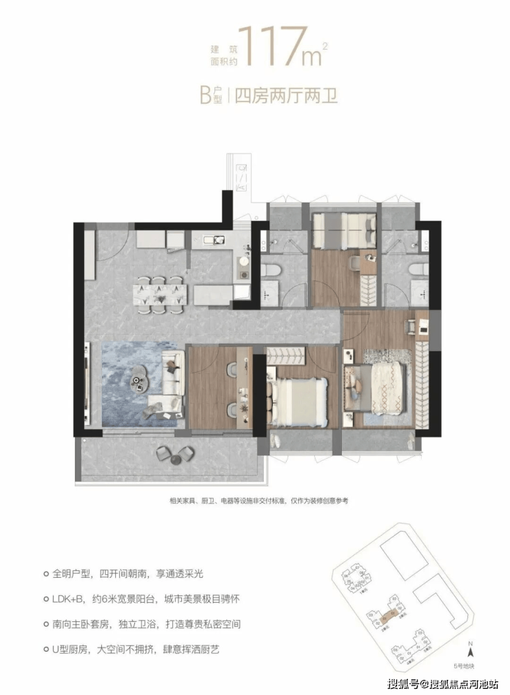 约117㎡和约125㎡4房2厅2卫,两个户型空间相似,125㎡是117㎡户型的plus版,南向全明4房,各功能间尺度较为舒阔,带宽景阳台,户型可塑性强。