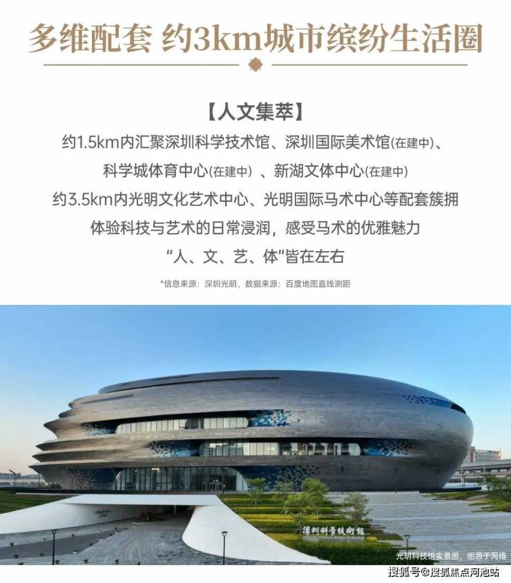 约1.5km内汇聚深圳科学技术馆、深圳国际美术馆(在建中)、科学城体育中心(在建中)、新湖文体中心(在建中)约3.5km内光明文化艺术中心、光明国际马术中心等配套簇拥。