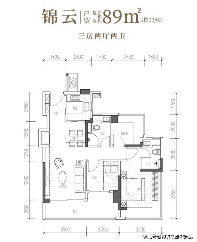 89㎡的3房2厅2卫,6栋02/03户型,设计的是经典竖厅格局,客厅3.5米开间,LDKB一体化,S墙设计预留冰箱卡槽位,三开间朝南,动静分区,主卧+次卧270°无柱转角飘窗,分别做到了主卧15.25㎡/次卧7.56㎡/次卧6.48㎡(包含墙体飘窗),U型厨房烟道外置,卫生间干湿分离,得房率约97.47%(包含赠送),客厅连接次卧出大阳台约11.46平,西南或东南朝向。主要区别在于次卧跟主卫空间。