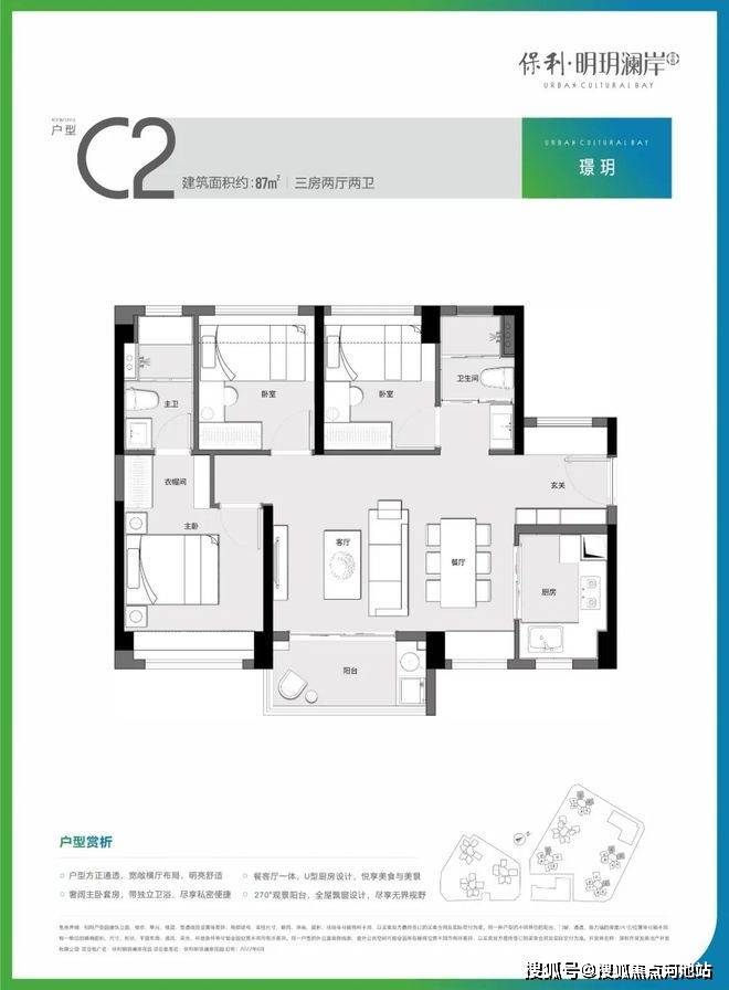 87㎡的3房2厅2卫,设计的是横厅南北通透格局,客餐厅5.4米开间,进门独户玄关,主卧大套间,U型厨房,公卫三段式分离设计,得房率:77.57%(不含赠送),阳台主朝西南向、东南向或东西通透。