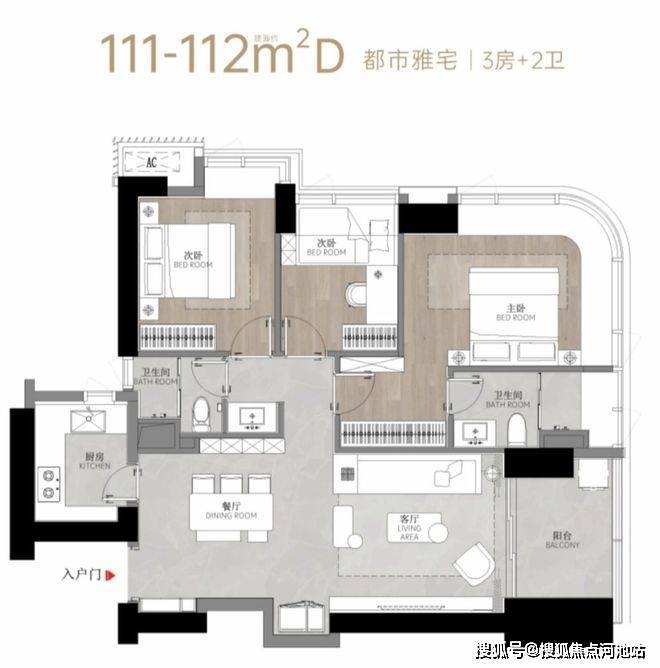 建面约111㎡的D户型,3房2卫,02梯腿折后均价约9.18万/㎡,03梯腿折后均价约9.44万/㎡。