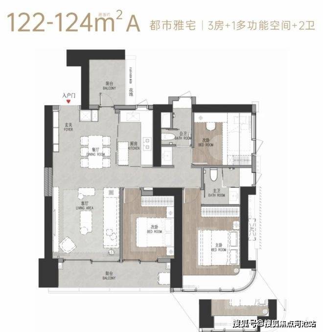 3+1多功能空间,2卫格局,独立玄关的设置,让归家的第一眼,就气派斐然,同时兼顾收纳功能。餐客厅一体化,大阳台搭配餐厅飘窗,增大景观采光面。