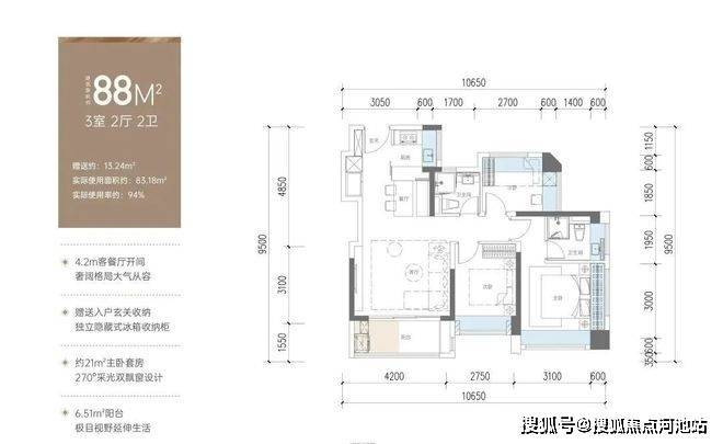88㎡3房2卫,折后总价245万起,单价约2.78万/㎡