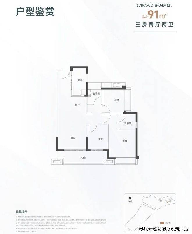 91㎡的3房2厅2卫,设计的是经典竖厅格局,进门入户玄关,LDKB一体化设计,三开间朝南,动静分区,客厅连接次卧出大阳台,L型厨房,公卫三段式分离,得房率约82%(不含赠送),东南朝向。