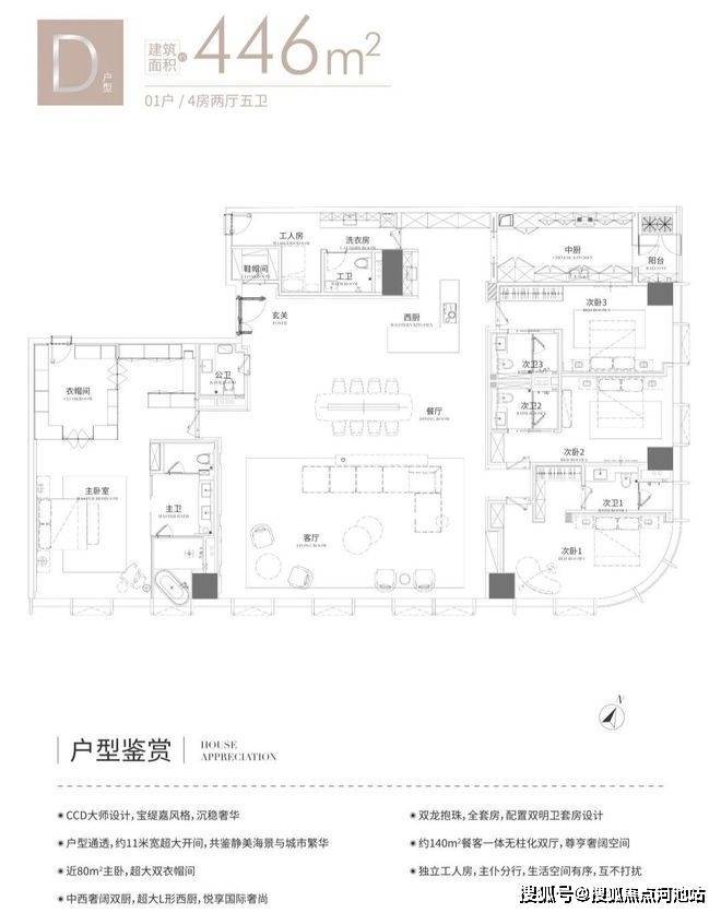 D户型446㎡为4+1房2厅2厨5卫,东南朝向,双龙抱珠全套房设计。