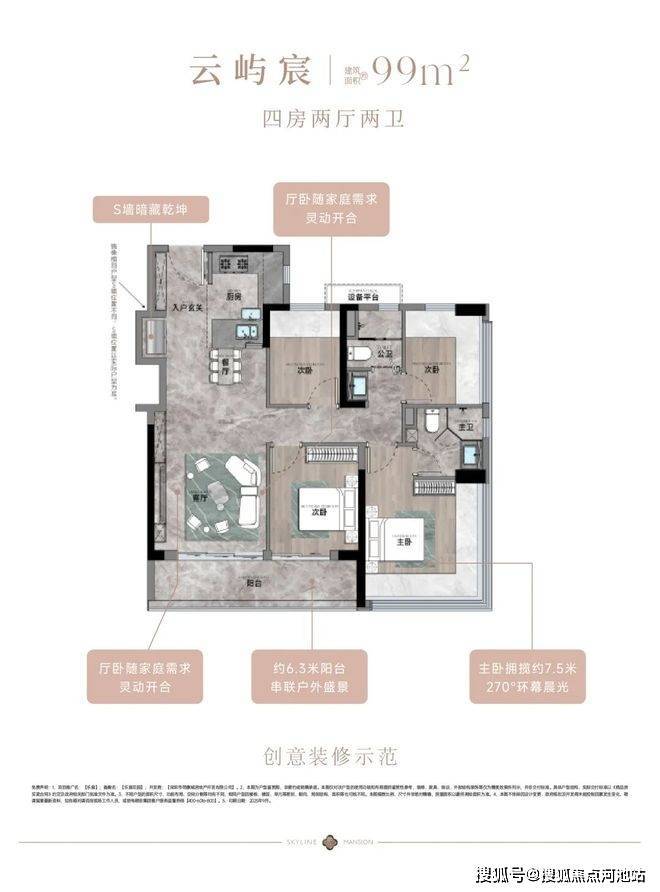 99㎡的4房2厅2卫,设计的是竖厅格局,客厅3.55米开间,LDKB一体化,S墙设计预留双开门冰箱卡槽位,三开间朝南,动静分区,分别做到了主卧15.26㎡/次卧9.57㎡/次卧6.96m²/次卧6.96㎡(包含墙体飘窗),U型厨房,公卫三段式干湿分离,赠送设备平台,得房率约79.5%(不含赠送),套内面积79.29㎡,客厅连接次卧出9.37m²大阳台西南或东南朝向。亮点:99平做到了4房2卫,主卧270°无柱转角飘窗,厨房烟道外置+额外赠送设备平台,并且是纯南向格局。
