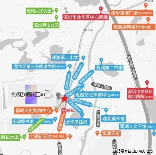 观澜汇与龙华区府仅一路之隔,项目三期过去的直线距离仅约400米(根据百度测距,仅供参考)。