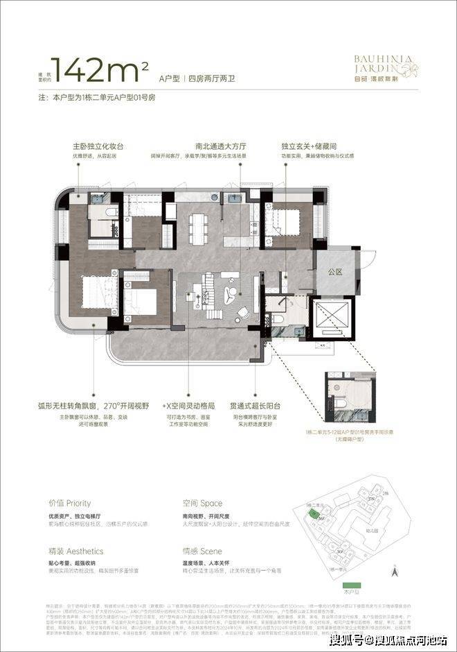 新规设计,得房率约为95%(含赠送)。户户大阳台,4梯5户,独立电梯厅。