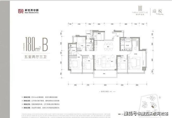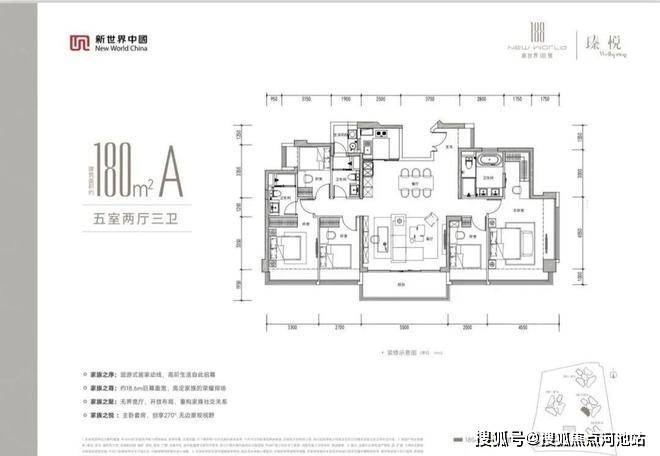 180㎡的5房2厅3卫,设计的是竖厅双龙抱珠格局,客厅5.5米开间,LDKB一体化设计,五开间朝南,约18.6米巨幕面宽,双主卧套间,分别做到了主卧30.5㎡/次卧15.45㎡/次卧11.75㎡/次卧10.87㎡/次卧8.5㎡(包含墙体飘窗),U型厨房,公卫带1个生活阳台约3.89平,阳台约10.73㎡西南朝向。