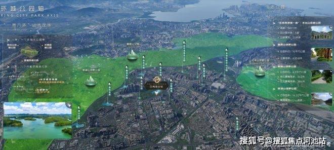 周边环绕民治水库、民乐水库、南坑水库等湖景及阳台山森林公园、北站红木山郊野公园、梅林山郊野公园、银湖山郊野公园、白石龙音乐公园、北站绿芯公园、南园公园、逸秀公园等城市生态绿轴。