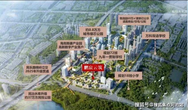 <教育>:配建一所12班幼儿园;北侧在建的区属公办72班九年一贯红山中学民治校区,主体结构已于今年2月份封顶,学校占地面积约3.3万平方米,建筑面积约6.6万平方米,其中小学48班/2160学位、初中24班/1200学位;