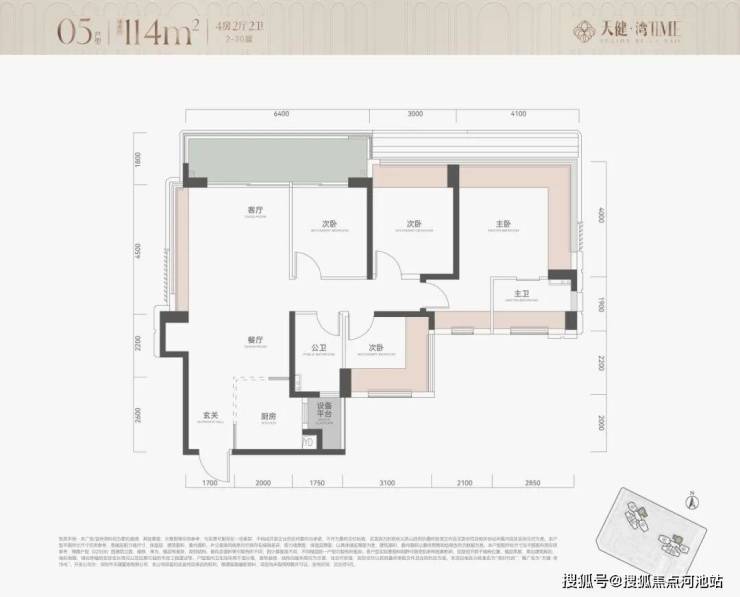 114㎡的4房2厅2卫,竖厅格局,客厅3.7米开间,LDKB一体化,客厅双面采光,凹墙设计预留冰箱卡槽位,动静分区,L型厨房还带1个设备平台约2.86㎡,卫生间干湿分离,客厅连接次卧出6.4米长的大阳台约11.52㎡。东北朝向,得房率约81.4%(不含赠送),加上赠送后得房率约103.9%。
