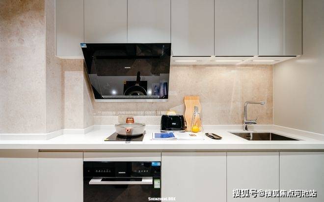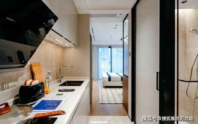 从玄关进门,一侧是隐藏式鞋帽柜,入门即收纳。一字型开放厨房,把过道纳入餐厨区,避免了逼仄感,油烟机、燃气灶一应俱全。另一侧为干湿分离的卫浴,合理地规划了每一寸空间。