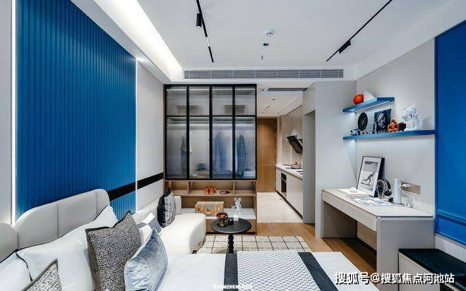 这个38平米的户型,将餐厅、卧室与起居空间结合,最大限度地保持了空间的通透性。客厅温馨小巧,床边即是开放式阳台,直面开阔的户外空间。