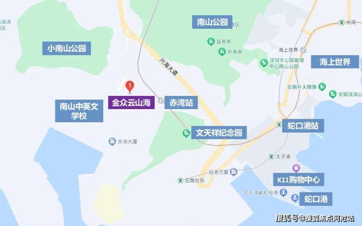 金众云山海位于蛇口赤湾片区,距离赤湾地铁站E口步行约200米,旁边即是赤湾总部大厦。