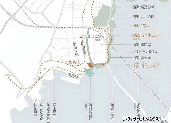 中信信悦湾项目坐落于深圳市南山蛇口望海路与后海滨路交汇处,堪称深圳湾 “终极收藏级” 地块 —— 三面环海,拥有永久性无遮挡一线海景,南侧与斥资 30 亿打造的深圳歌剧院仅一路之隔,东侧远眺深圳湾及香港天际线,西侧紧邻蛇口山公园,真正实现 “推窗见海,出门遇艺术”。更关键的是,这里处于蛇口国际海洋城、后海总部基地、深圳湾超级总部三大核心规划交汇处,既能享受成熟豪宅区氛围,又能承接城市发展红利,地段稀缺性无可复制。