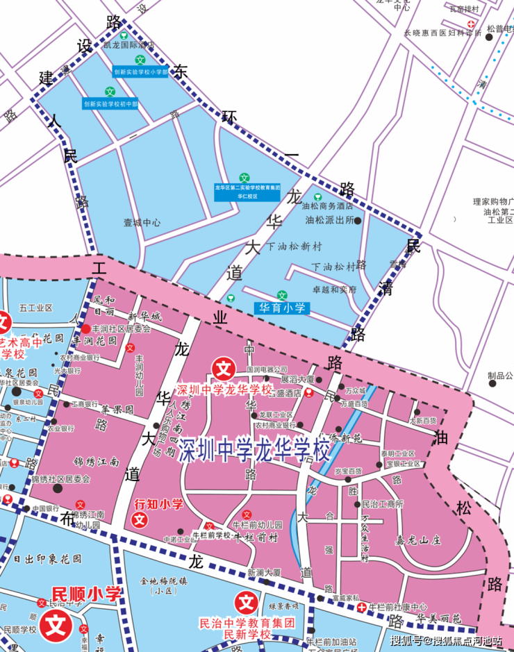 深中龙华学校所在的红色片区,也就是单校划分片区(即学校划片招生、生源就近入学);蓝色片区,也就是多校联动学区,多校联动学区是啥意思呢?