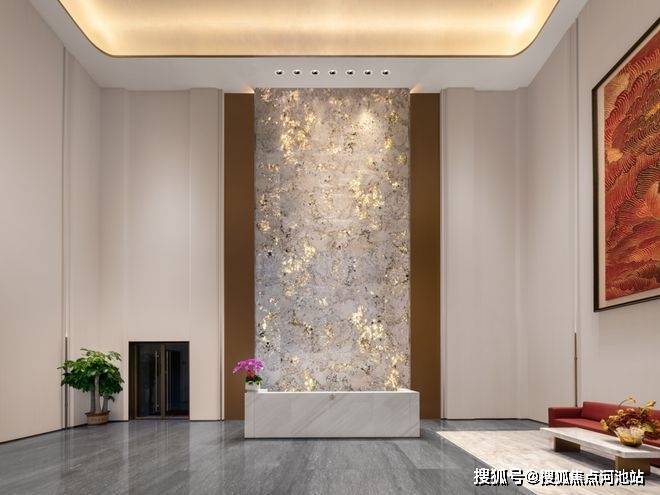从社区主入口的酒店式归家大堂开始,体验便不同凡响。意大利宝格丽奢石接待台、巴西潘多拉透光奢石背景墙、约9米挑高的弧顶艺术涂料天花板与牡丹油画挂画,共同营造出入户的尊崇仪式感。两侧对植的约20年树龄造型冬青,以盎然生机寓意“基业长青”,仪式感与归属感自此油然而生。