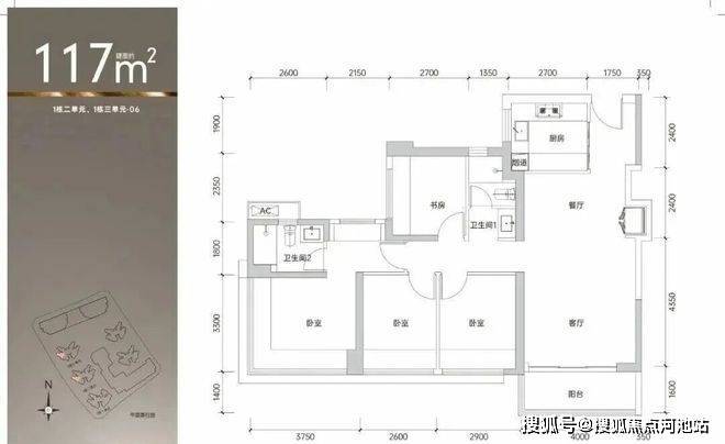 117㎡的4房2厅2卫,1栋2/3单元06户型,设计的是经典竖厅格局,进门入户玄关,客厅4米开间,LDKB一体化,S墙设计预留冰箱卡槽位,四开间朝南,动静分区,4个卧室分别做到了主卧16.5㎡/次卧9.57㎡/次卧8.58㎡/次卧7.97㎡(包含墙体飘窗),U型厨房,公卫三段式分离,得房率约75.4%(不含赠送),东南或西南朝向。套内面积88.24㎡+赠送面积13.43㎡=实得101.67㎡,加上赠送后得房率约86.87%。
