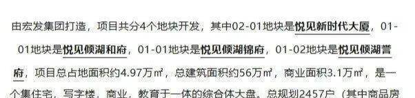 宏发悦见倾湖,由宏发集团打造,项目共分4个地块开发,其中02-01地块是悦见新时代大厦,01-01地块是悦见倾湖和府,01-01地块是悦见倾湖锦府,01-02地块是悦见倾湖誉府,项目总占地面积约4.97万㎡,总建筑面积约56万㎡,商业面积3.1万㎡,是一个集住宅,写字楼,商业,教育于一体的综合体大盘。